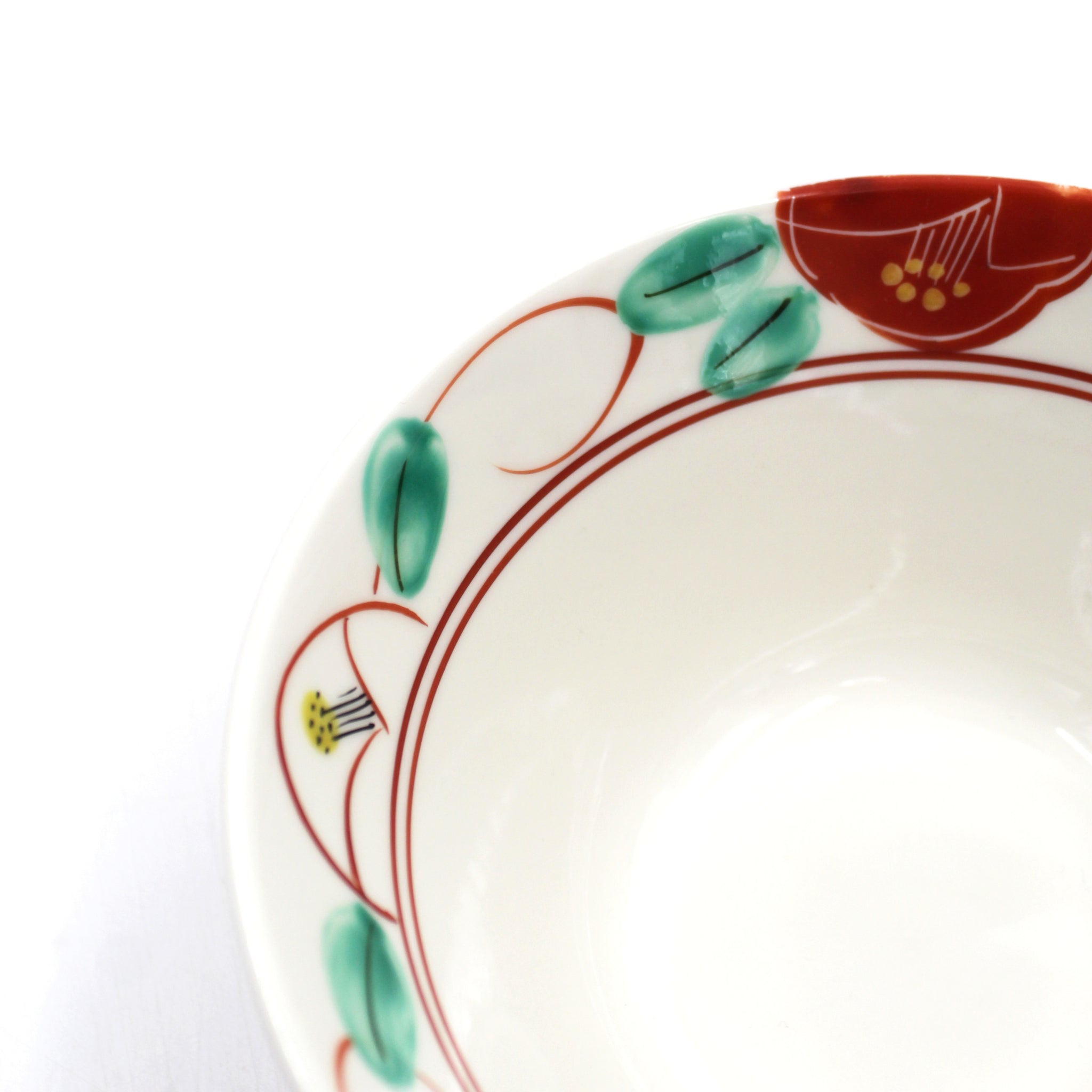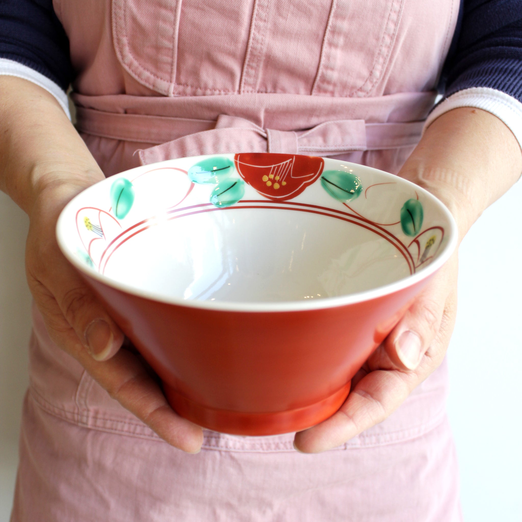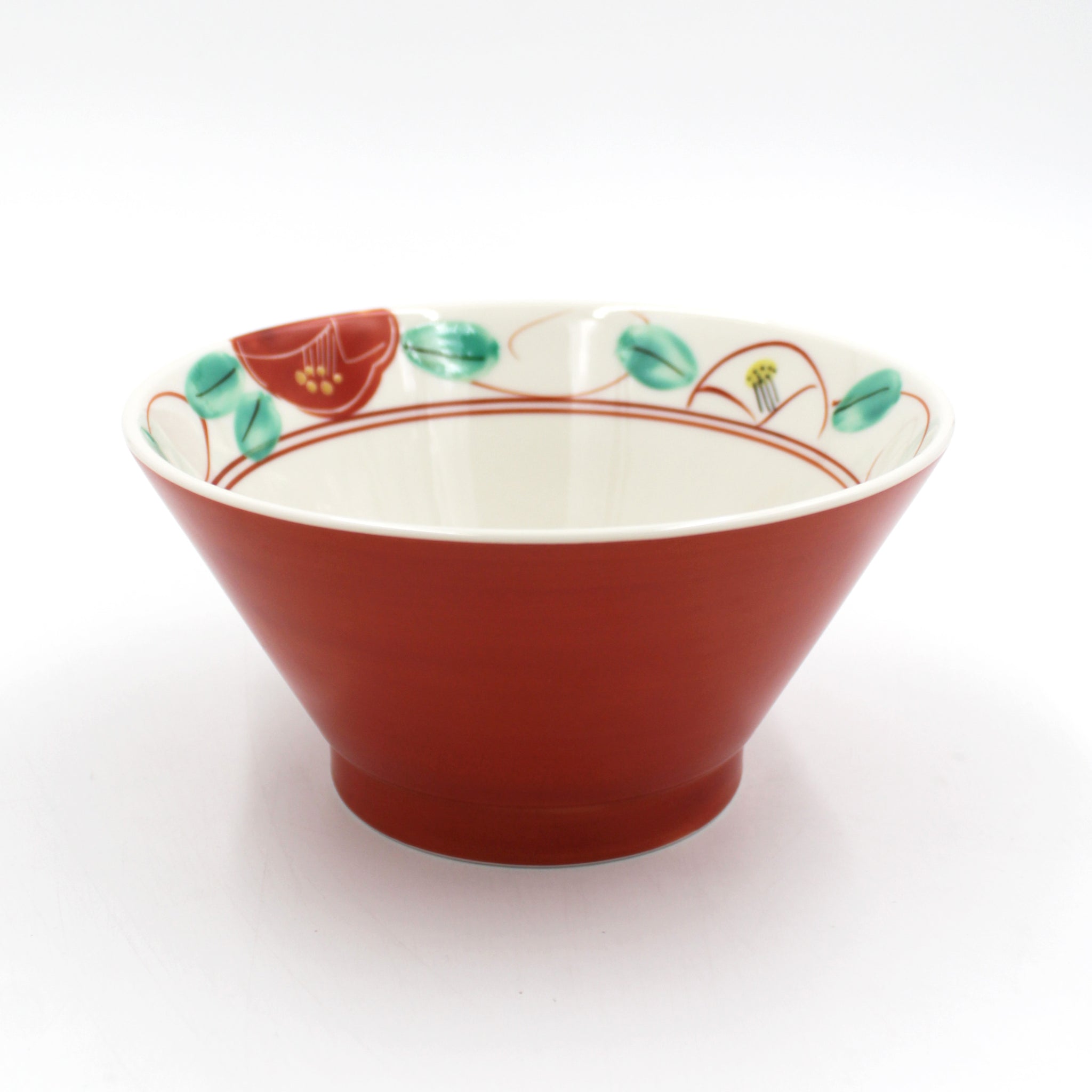 Inside the bowl, the hand-painted camellia motif in soft green and red accents adds a lively contrast against the white porcelain interior. The generous size and gracefully flared shape make it ideal for serving hearty donburi dishes, noodles, or salads while beautifully framing the ingredients inside.