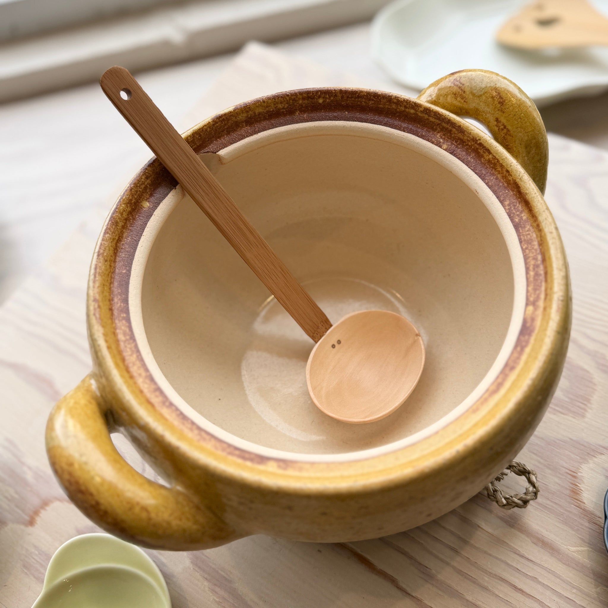The handle is crafted from bamboo, while the spoon part is made from Lotus Wood. This combination creates the beautiful natural contrast aesthetically, makes it sturdier and easy to scoop.