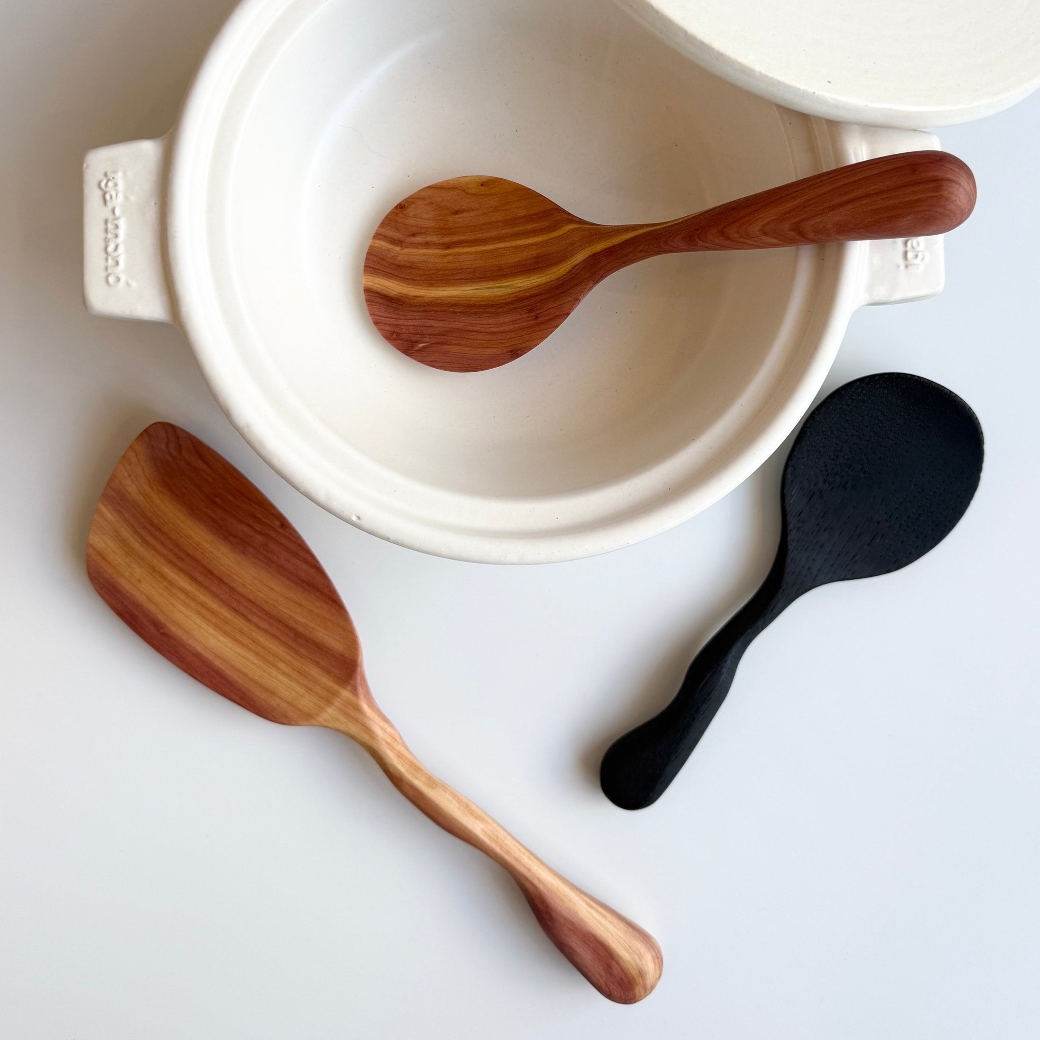 Each paddle is carved from a single piece of wood and carefully finished to highlight the natural grain and tone. Lightweight yet solid in the hand, it is especially suited for use with donabe rice cookers. With use, the wood develops deeper character while maintaining its smooth touch.