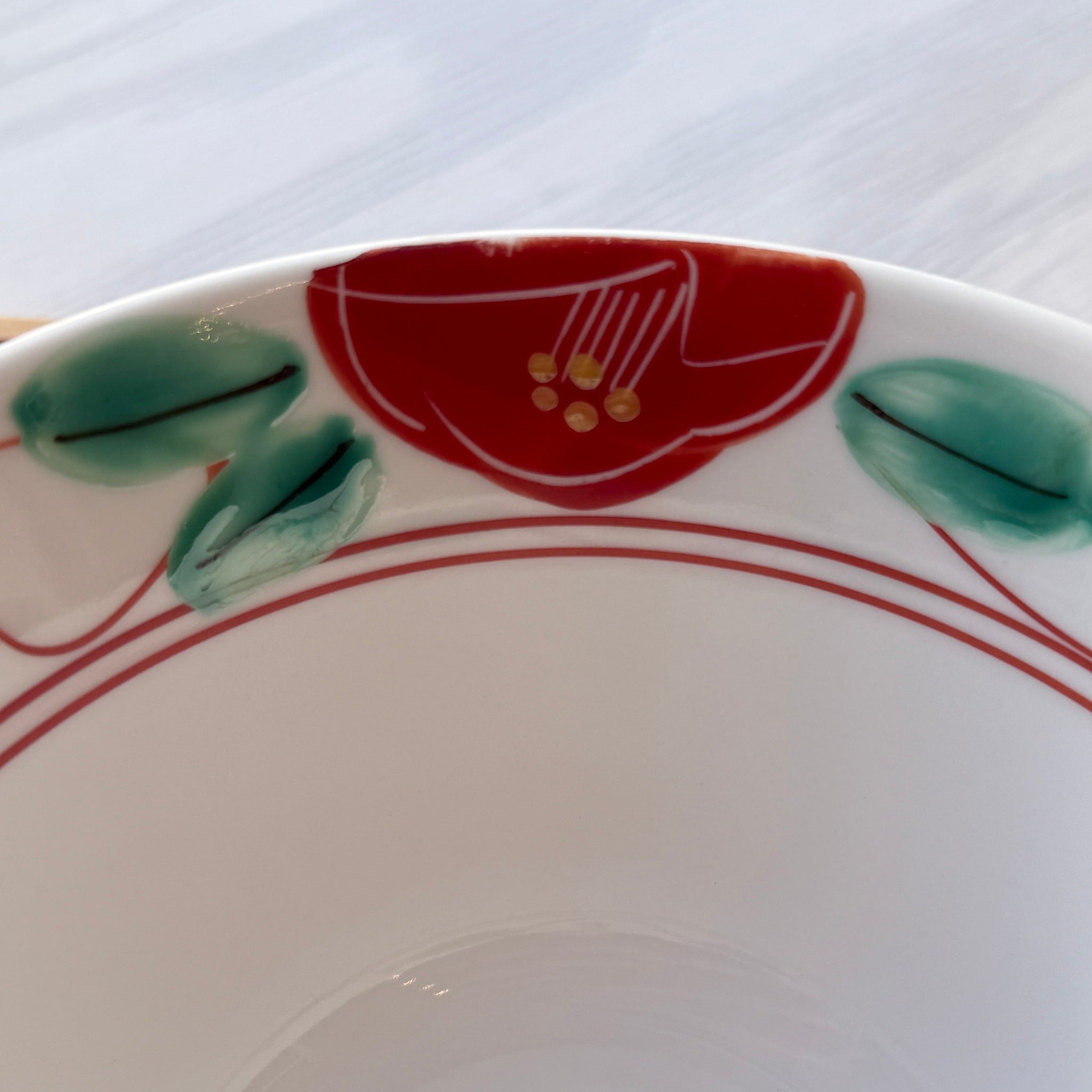 Inside the bowl, the hand-painted camellia motif in soft green and red accents adds a lively contrast against the white porcelain interior. The generous size and gracefully flared shape make it ideal for serving hearty donburi dishes, noodles, or salads while beautifully framing the ingredients inside.