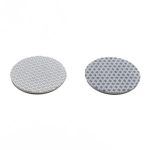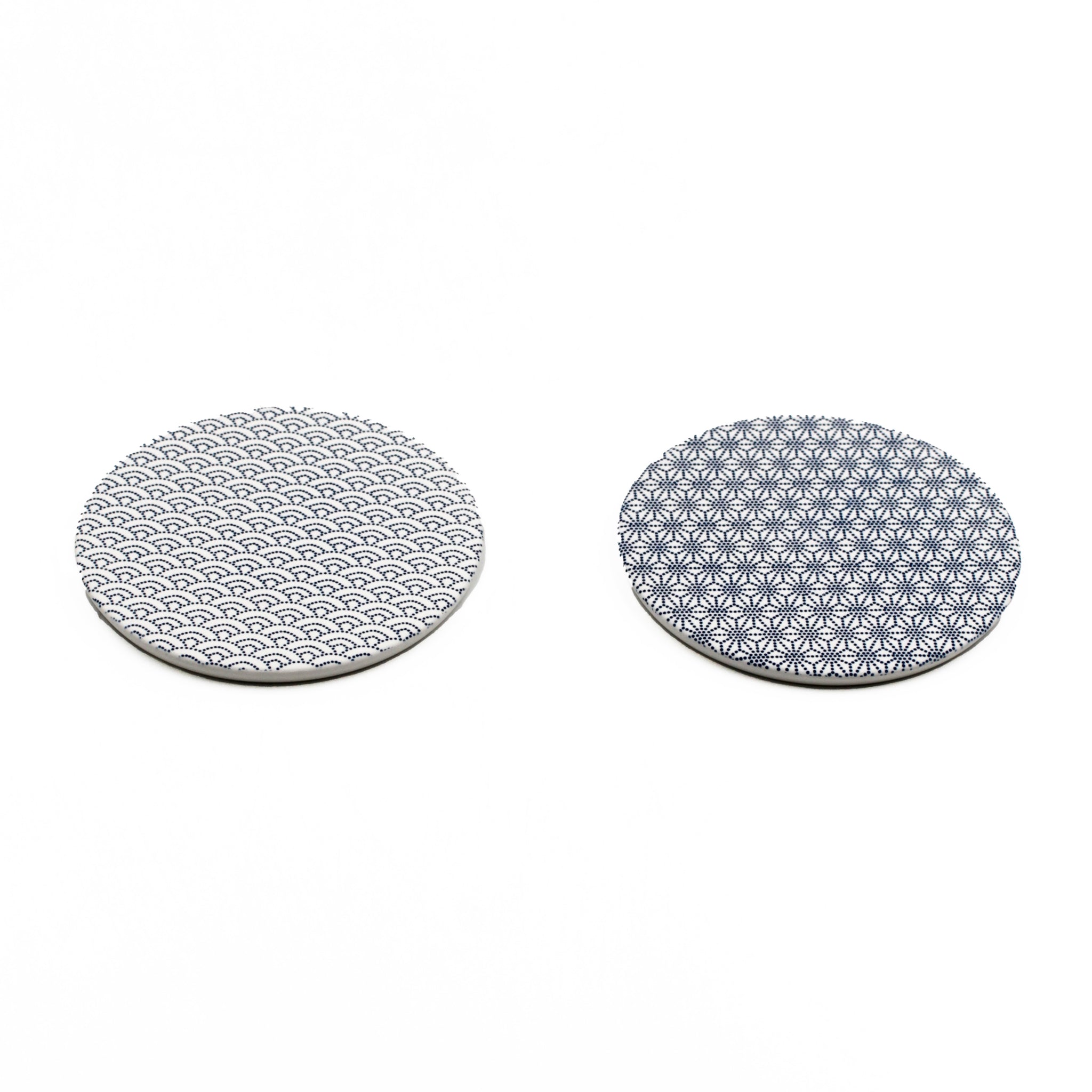 Beautifully crafted absorbent ceramic coasters featuring traditional Japanese patterns. Available in two designs: Hemp Leaf (麻の葉), symbolizing growth and resilience, and Blue Wave (青海波), representing waves of fortune. The porous ceramic material absorbs moisture efficiently, keeping your surfaces dry and protected. Lightweight and reusable, these coasters are easy to clean and suitable for both cold and hot items. They can also be used for drying kitchen or face brushes.