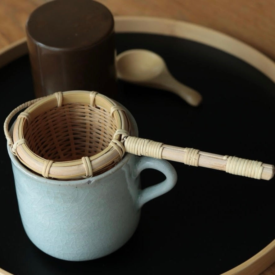 Masterfully woven, this sturdy bamboo Tea Strainer adds a rustic touch to all your tea endeavors. Simply place the strainer on top of a tea cup or bowl to strain out steeped tea leaves. The strainer may impart a pleasant and soothing aroma of bamboo, heightening the relaxation power of your tea-- this will become more subtle through continual use.