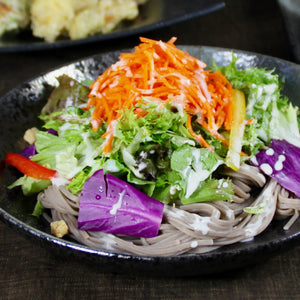 Enjoy it cold as zaru soba by rinsing well after boiling and serving with mentsuyu dipping sauce, or savor it in a comforting hot broth with seasonal toppings. These noodles are versatile and nourishing, with no fat or cholesterol and a good amount of plant-based protein. Their rustic, wholesome character pairs beautifully with traditional Japanese condiments like grated daikon, scallions, wasabi, or even a touch of yuzu zest.