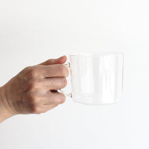 This clear glass mug is part of the collaboration between Japanese tableware brand Common and HARIO, Japan’s trusted heat-resistant glassmaker since 1921. The simple form with softly curved lines offers a balanced, comfortable hold and is designed for easy daily use. Its transparent body lets you enjoy the color of tea, coffee, or any beverage, hot or cold.